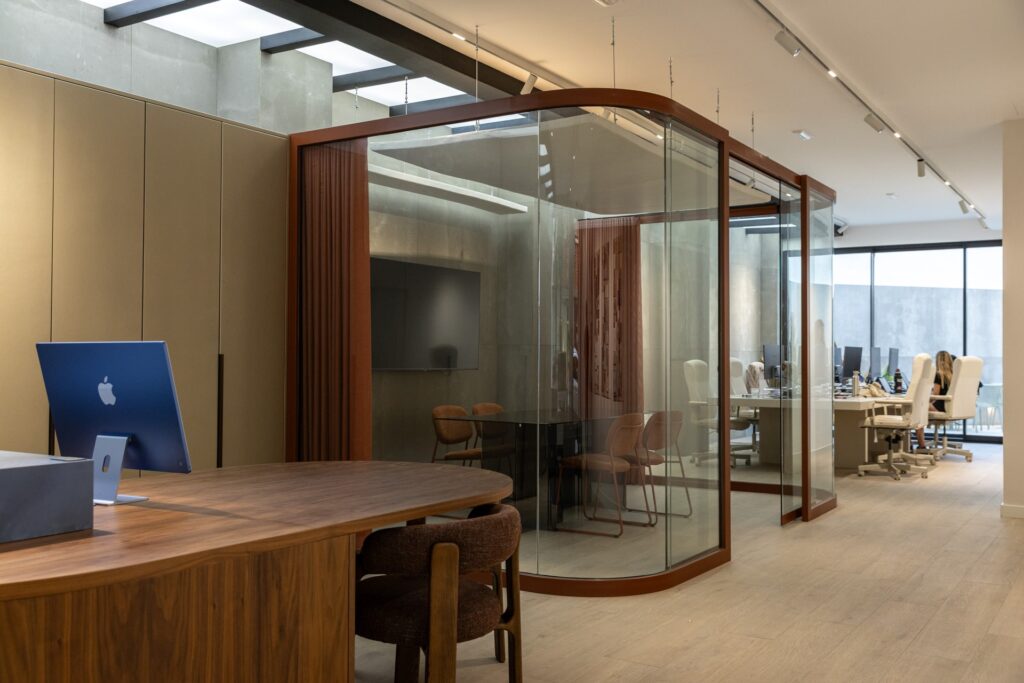 En un siguiente punto, más alejado del acceso, encontramos el Fitting Room, una sala híbrida pensada como un espacio que pueda adaptarse a diferentes situaciones. Desde una revisión de proyecto, hasta una primera reunión de toma de contacto online o, incluso, un meeting interno del equipo Cubicup. Por esto, esta sala se materializa como una burbuja acristalada, que permite diferentes capas de privacidad gracias a un sistema de aperturas y cierres textiles que actúan de fi ltro según las necesidades.