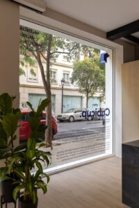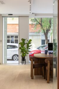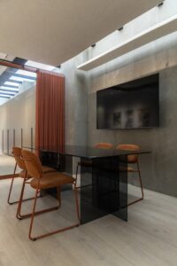 En un siguiente punto, más alejado del acceso, encontramos el Fitting Room, una sala híbrida pensada como un espacio que pueda adaptarse a diferentes situaciones. Desde una revisión de proyecto, hasta una primera reunión de toma de contacto online o, incluso, un meeting interno del equipo Cubicup. Por esto, esta sala se materializa como una burbuja acristalada, que permite diferentes capas de privacidad gracias a un sistema de aperturas y cierres textiles que actúan de fi ltro según las necesidades.