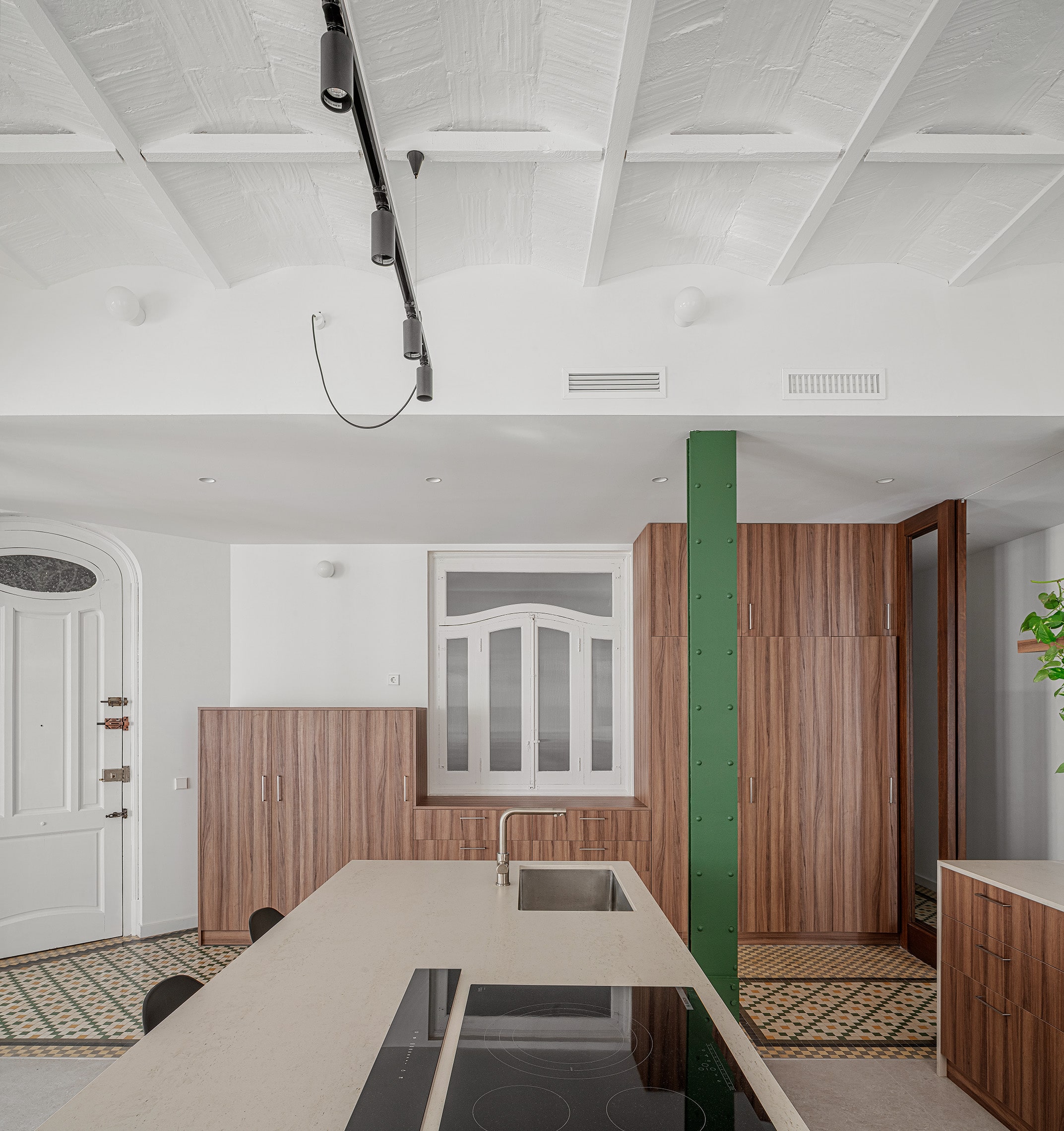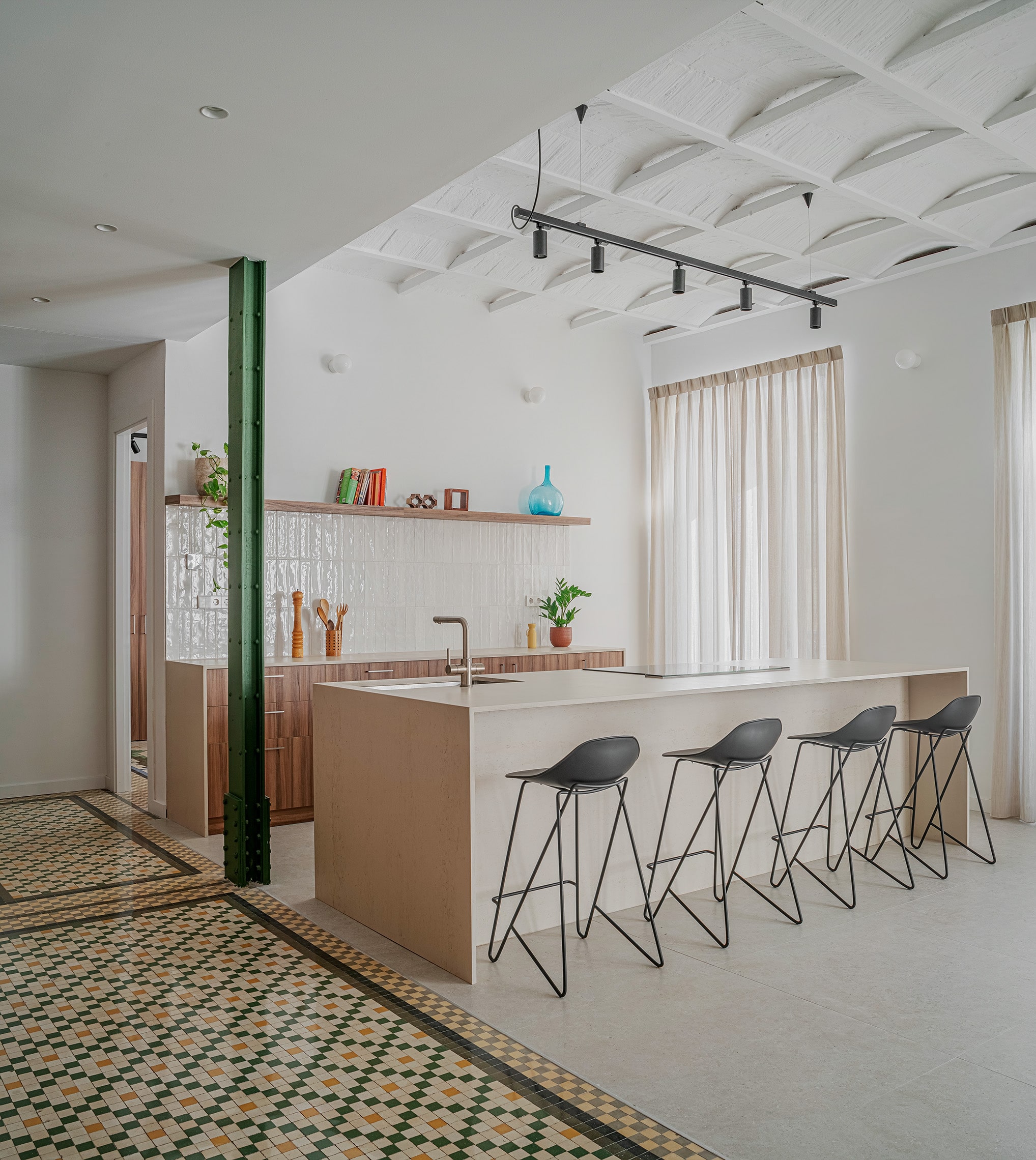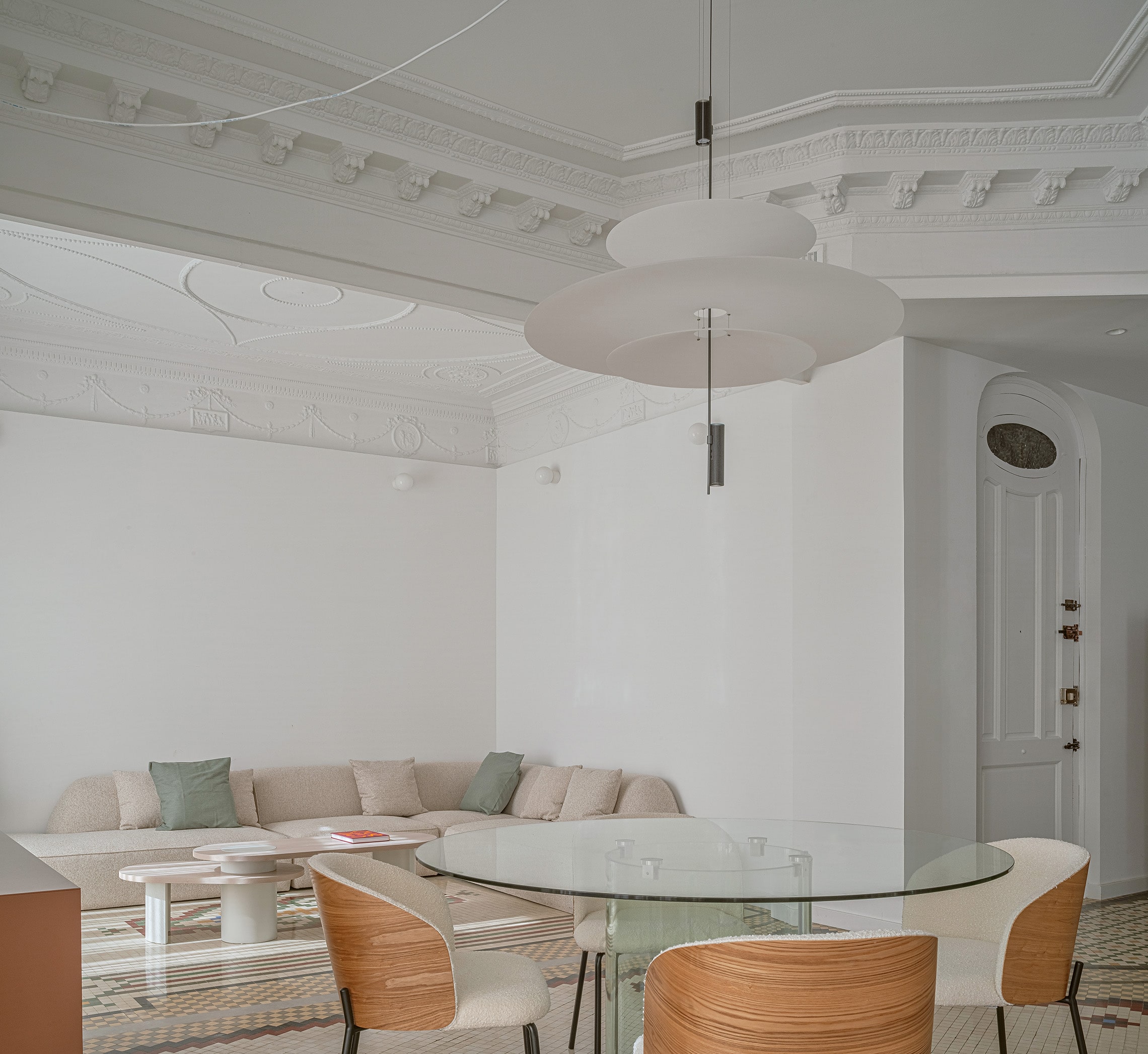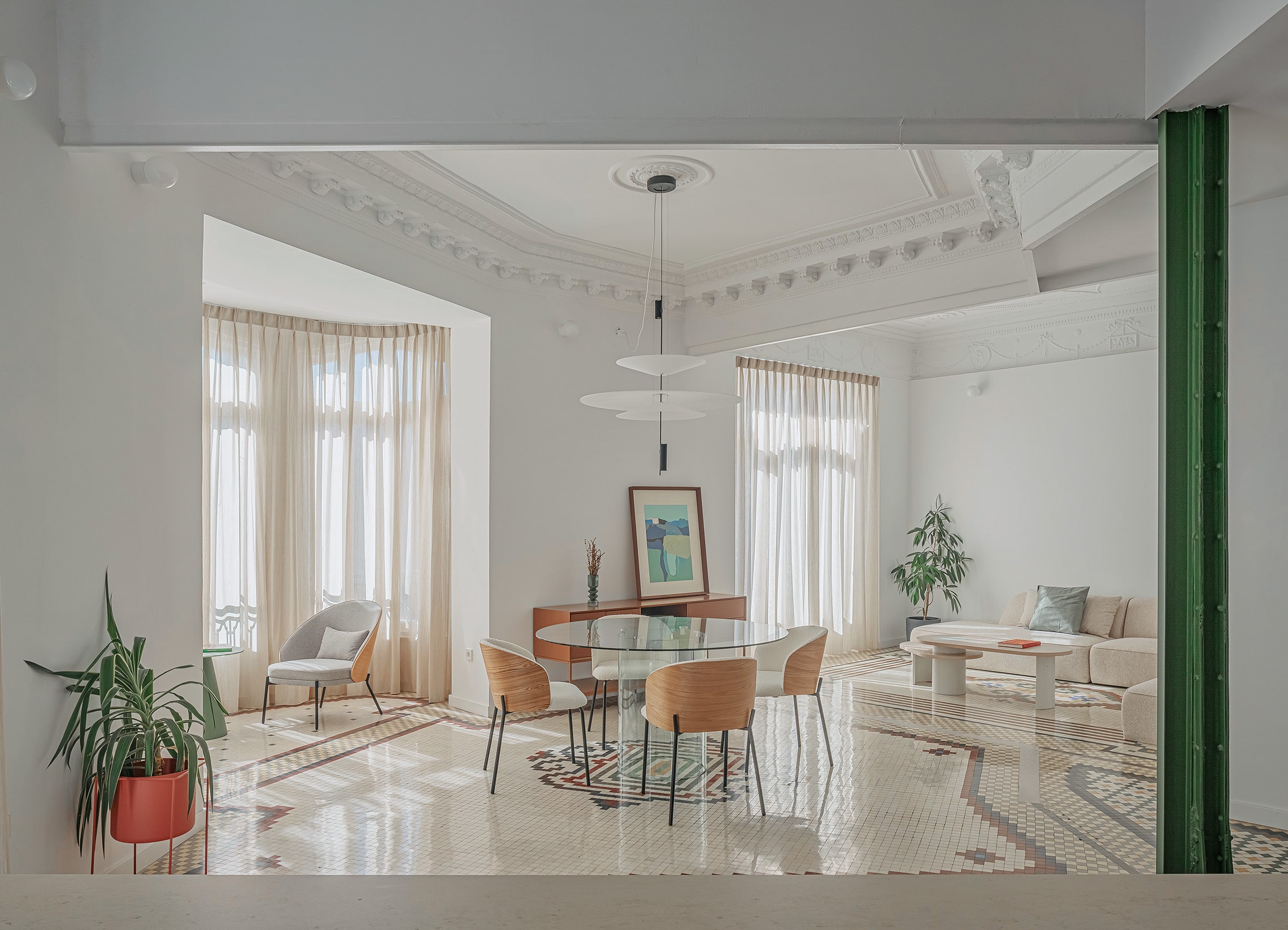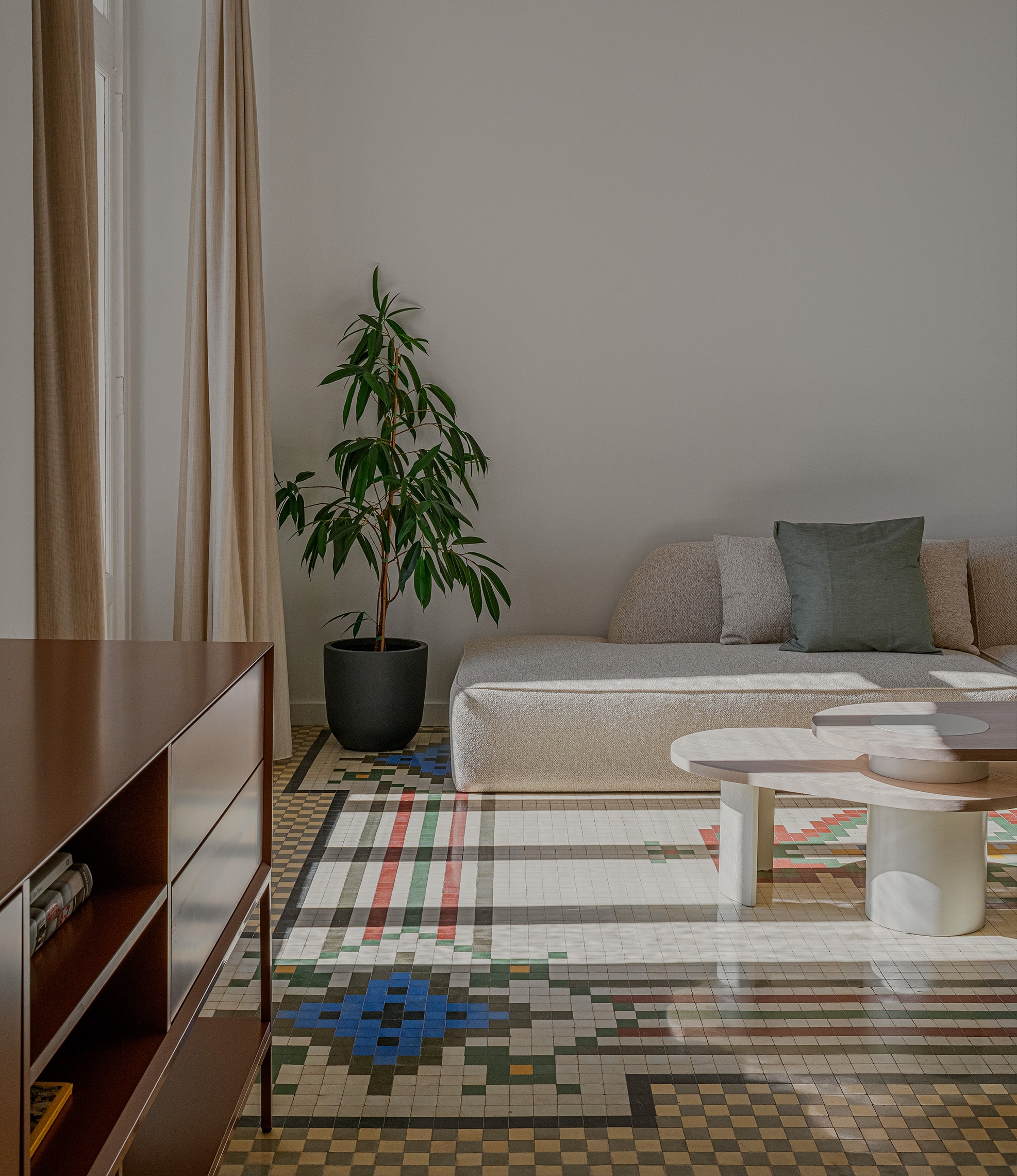 En esta intervención apostamos por preservar y realzar esos elementos: los techos altos con molduras y los suelos hidráulicos se mantienen como protagonistas de la vivienda.
